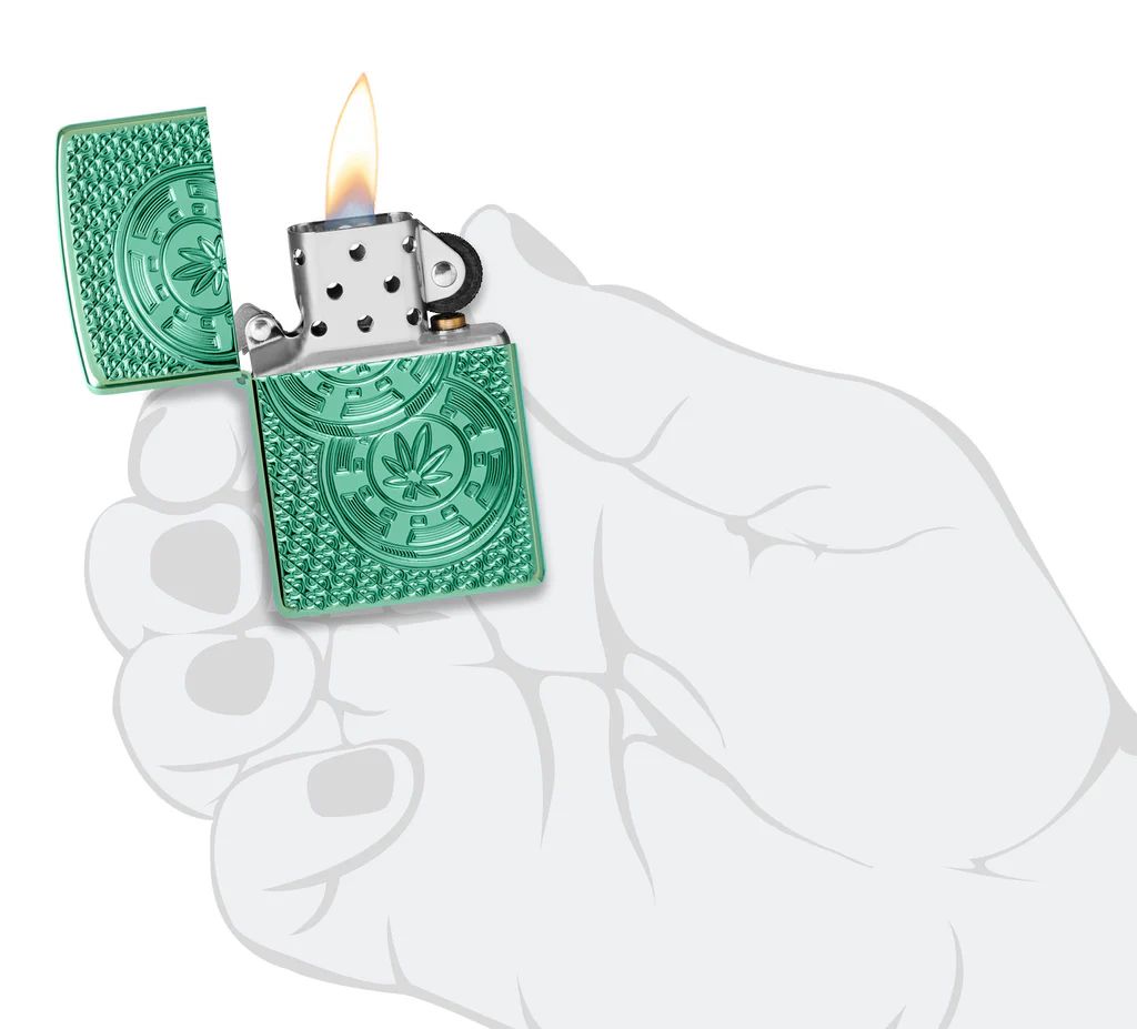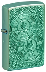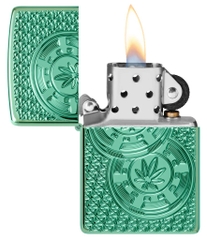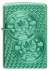 Hộp Quẹt Zippo 46144 Toker Chips Design Deep Carve High Polish Green là dòng bật lửa vỏ dày đồng thau mạ Chrome xanh tắc kè, xanh biến màu, khắc sâu hình cannabis poker (thẻ tiền trong bài Poker). Hộp giấy Zippo đi kèm có thể sử dụng như hộp quà tặng. Khi sử dụng với xăng Zippo chính hãng bật lửa sẽ phát huy tối đa hiệu quả cháy, chống gió và giữ xăng lâu hơn (1 ngày bật 20 lần, 1 lần 3 giây, điều kiện buồng đốt sạch, tim trắng, 7 ngày sẽ cạn xăng).