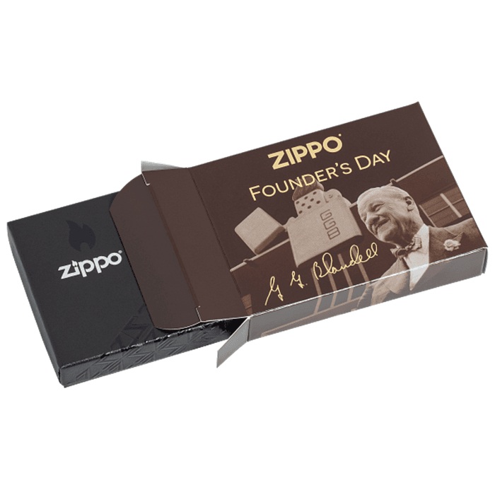 Bạn đã bao giờ tự hỏi tại sao người sáng lập kiêm nhà phát minh ngài George G. Blaisdell lại đặt tên bật lửa là Zippo ko? Tại vì ông rất thích từ "zipper" (khóa kéo) và quyết định rằng Zippo nghe rất hiện đại và độc đáo. Hộp Quẹt Zippo 46213 Founder's Day này ra đời nhằm tôn vinh nguồn cảm hứng của ông Blaisdell. Được khắc ở cả hai mặt của sản phẩm, một chiếc khóa kéo hé lộ chiếc bật lửa chống gió. Sự kết hợp lần đầu tiên giữa quy trình Luster và 540 Fusion. Logo Zippo được thể hiện bằng tông màu đồng thau lấp lánh. Giới hạn chỉ 10.000 chiếc, ruột mạ vàng, hộp đựng in hình kỷ niệm ông tổ Zippo thích hợp sử dụng như hộp quà tặng, hoặc trưng bày