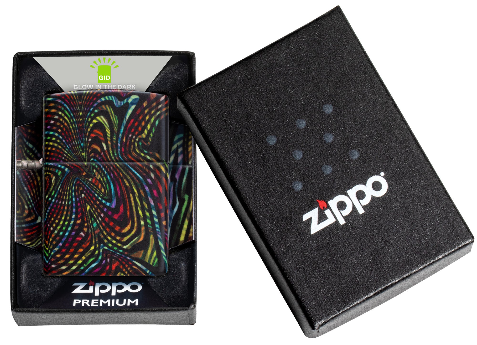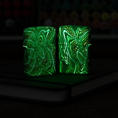Hộp Quẹt Zippo 46427 Glowing Illusion Design là dòng bật lửa sơn tĩnh điện dạ quang, phát sáng trong bóng tối, được hãng Zippo in hình hoa văn xoắn ốc lên 5 mặt. Hộp giấy Zippo đi kèm có thể sử dụng như hộp quà tặng. Khi sử dụng với xăng Zippo chính hãng bật lửa sẽ phát huy tốt đa hiệu quả cháy, chống gió và giữ xăng lâu hơn (1 ngày bật 20 lần, 1 lần 3 giây, điều kiện buồng đốt sạch, tim trắng, 7 ngày sẽ cạn xăng).