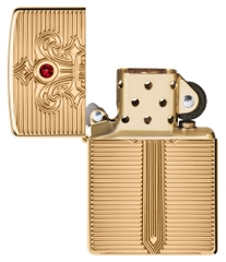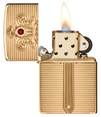 Hộp Quẹt Zippo 46737 Royal Saber Design là dòng bật lửa vỏ dày đồng vàng nguyên khối bóng sử dụng công nghệ khắc sâu tinh xảo lên mặt trước hình thanh kiếm của hoàng gia, chuôi kiếm được đính 1 viên đá pha lê màu đỏ ruby. Hộp giấy Zippo đi kèm có thể sử dụng như hộp quà tặng. Khi sử dụng với xăng Zippo chính hãng bật lửa sẽ phát huy tốt đa hiệu quả cháy, chống gió và giữ xăng lâu hơn (1 ngày bật 20 lần, 1 lần 3 giây, điều kiện buồng đốt sạch, tim trắng, 7 ngày sẽ cạn xăng).