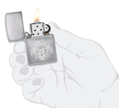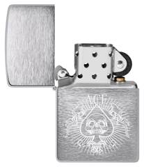 Hộp Quẹt Zippo 48500 là dòng vỏ đồng thau mạ Chrome xước vân ngang 2 mặt bóng cạnh sử dụng khắc công nghệ khắc laser lên mặt trước hình lá bài ách bích. Hộp giấy Zippo đi kèm có thể sử dụng như hộp quà tặng. Khi sử dụng với xăng Zippo chính hãng bật lửa sẽ phát huy tối đa hiệu quả cháy, chống gió và giữ xăng lâu hơn (1 ngày bật 20 lần, 1 lần 3 giây, điều kiện buồng đốt sạch, tim trắng, 7 ngày sẽ cạn xăng).