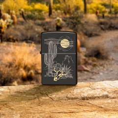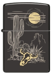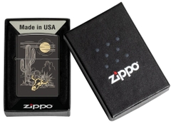 Hộp Quẹt Zippo 48968 Western Design Laser Two Tone High Polish Black là dòng hộp quẹt Zippo đồng thau mạ chrome màu gổ mun đen bóng được hãng Zippo khắc laser 2 màu hình sa mạc miền viễn Tây của Mỹ. Hộp giấy Zippo đặc biệt đi kèm có thể sử dụng như hộp quà tặng. Khi sử dụng với xăng Zippo chính hãng bật lửa sẽ phát huy tối đa hiệu quả cháy, chống gió và giữ xăng lâu hơn (1 ngày bật 20 lần, 1 lần 3 giây, điều kiện buồng đốt sạch, tim trắng, 7 ngày sẽ cạn xăng).