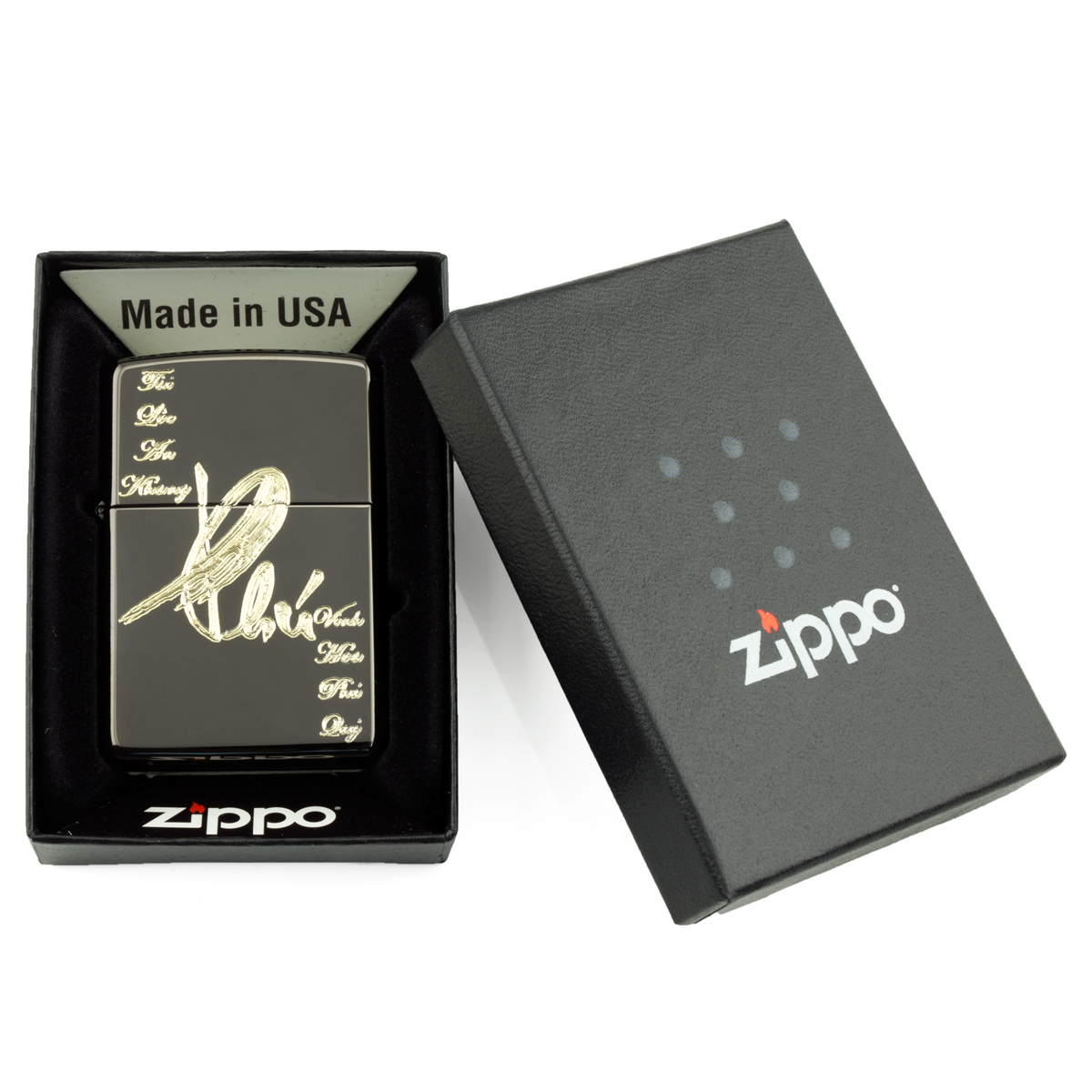Zippo Khắc Tay Chữ Phú là dòng bật lửa Zippo vỏ đồng thau mạ Chrome màu gỗ mun, bóng đêm. Được nghệ nhân khắc chữ Phú bằng dao kim cương từng nét tỉ mỉ, tinh xảo, vĩnh viễn không bao giờ phai. Mẫu Zippo khắc độc quyền chỉ có tại ZippoStore.vn. Hộp giấy Zippo đi kèm có thể sử dụng như hộp quà tặng. Khi sử dụng với xăng Zippo chính hãng bật lửa sẽ phát huy tối đa hiệu quả cháy, chống gió và giữ xăng lâu hơn.