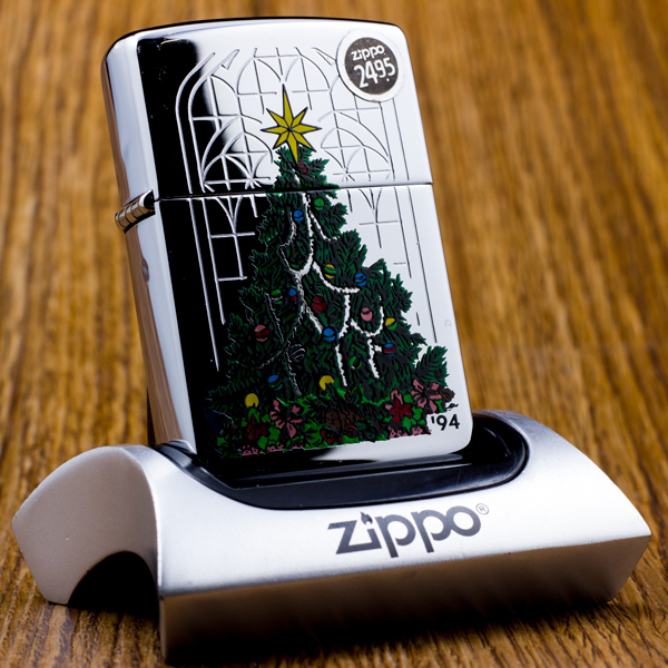Zippo La Mã Christmas Tree IX 1993 trên nền High Polish Chrome - Chrome sáng bóng sản xuất vào năm 1993, mộc đáy IX (9 la mã) hãng đã trang trí và in lên mặt trước của chiếc Zippo hình cây thông Noel đã được trang trí đèn quả châu xung quanh cùng một ngôi sao trên đỉnh, đằng sau đó là dập chìm khắc những hoa văn chìm để tao nên một bức tranh đầy không khí Noel, ngoài ra chiếc hộp cũng được trang trí phong cách Giáng sinh.