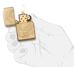 Zippo Tiger and Dragon Design 49024 dòng vỏ đồng vàng nguyên khối bóng, sử dụng công nghệ ăn mòn bằng Acid khắc hình ngọa hổ tàng long và bát quái ngay trung tâm Zippo. Hộp giấy Zippo đi kèm có thể sử dụng như hộp quà tặng. Khi sử dụng với xăng Zippo chính hãng bật lửa sẽ phát huy tối đa hiệu quả cháy, chống gió và giữ xăng lâu hơn (1 ngày bật 20 lần, 1 lần 3 giây, điều kiện buồng đốt sạch, tim trắng, 7 ngày sẽ cạn xăng).